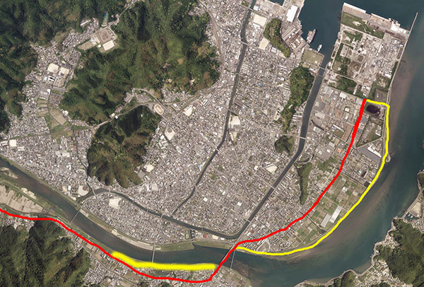 約7kmに及ぶ管路 黄色の線は迂回の為の新設管路ルート例(高橋案)